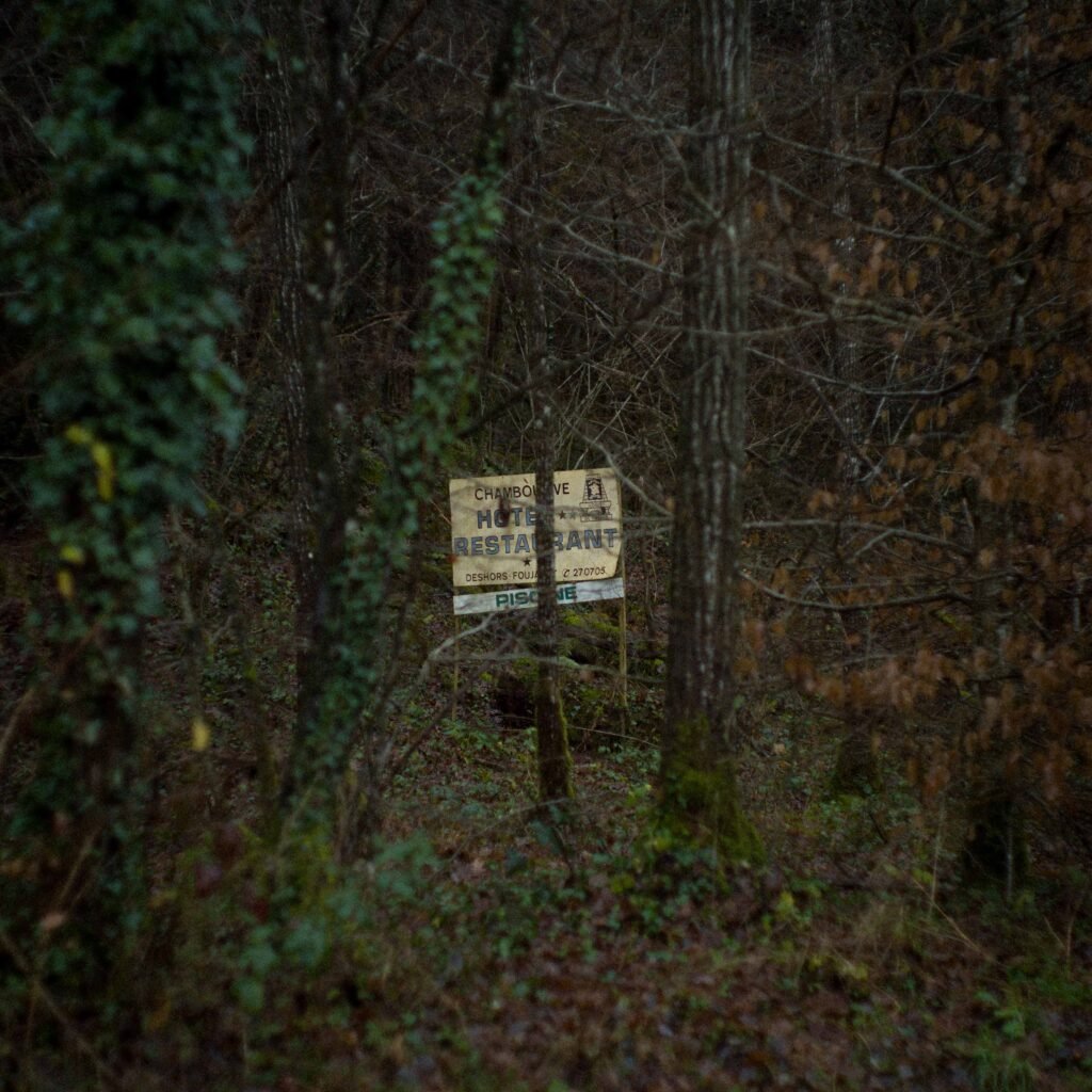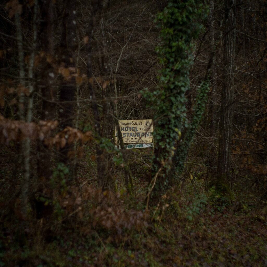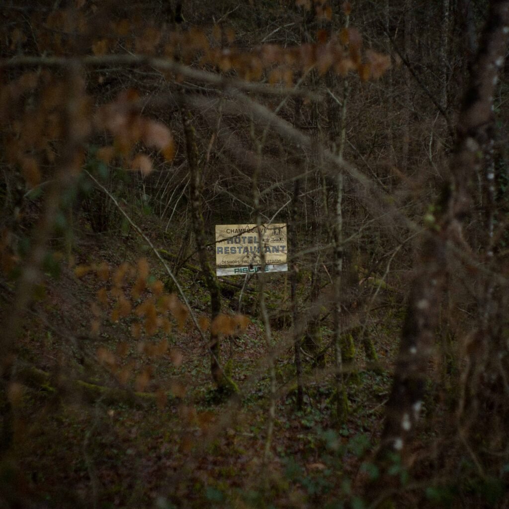 chamboulive, numéro de téléphone à six chiffres, je pense que la piscine n’existe plus depuis longtemps, l’hôtel existe peut-être encore, pas sûr, le panneau lui est maintenant perdu au milieu d’un bois