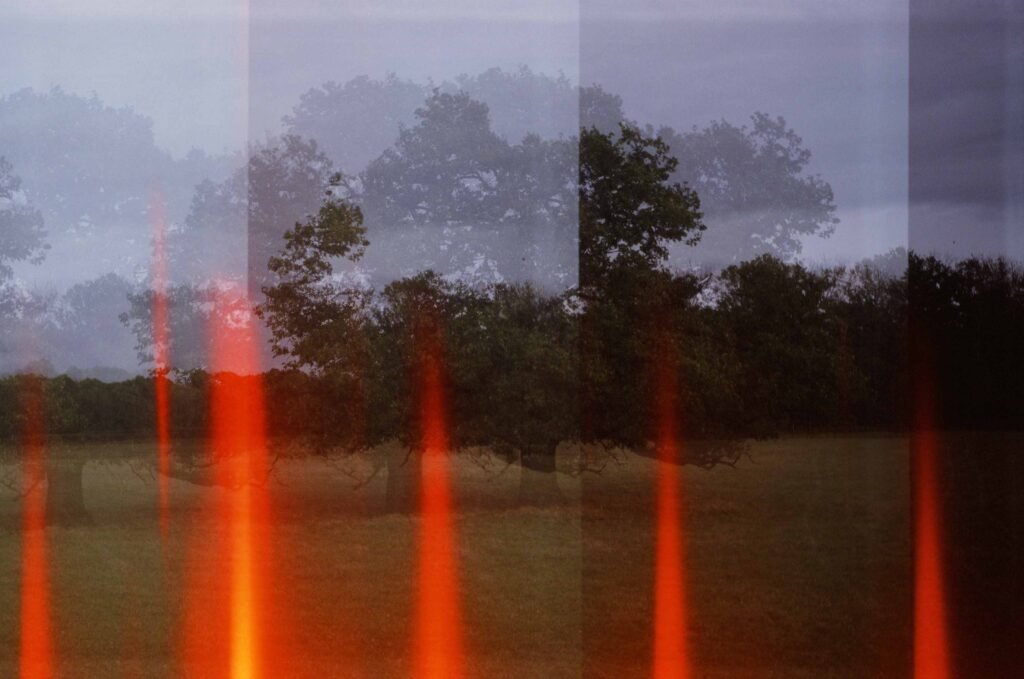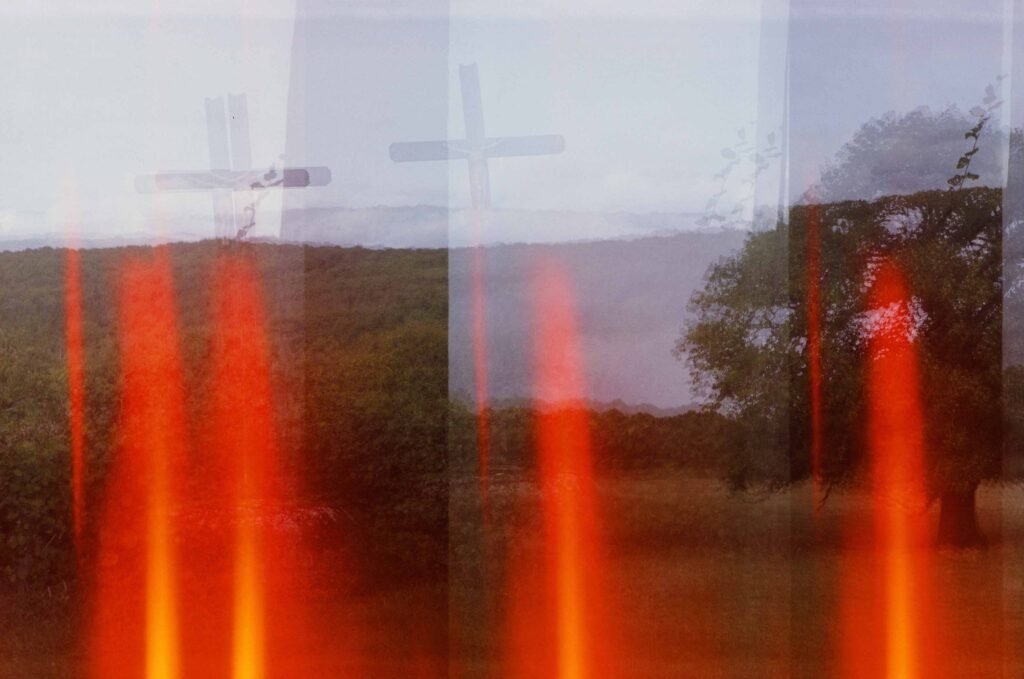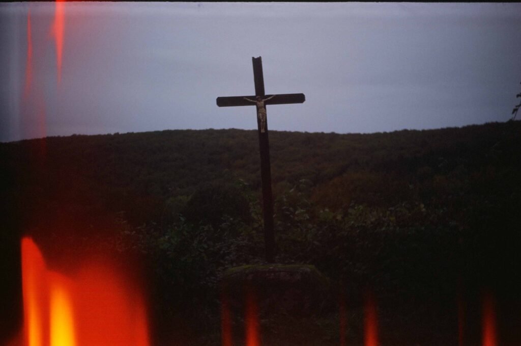 mon calvaire préféré et mon chêne préféré, photographiés avec un cosmic 35, un petit boîtier soviétique « compact » qui ressemble à un jouet en plastique de mauvaise qualité, l’avantage avec cet appareil c’est qu’il permet de réaliser des expositions multiples, l’inconvénient c’est que j’ai un mal de chien à rembobiner les films, et en plus cet exemplaire a un défaut, il produit des effets de flammes oranges, j’en ai racheté un autre sur le bon coin, pour 15 euros, on verra le résultat, si je parviens à rembobiner au moins un film sans le déchirer