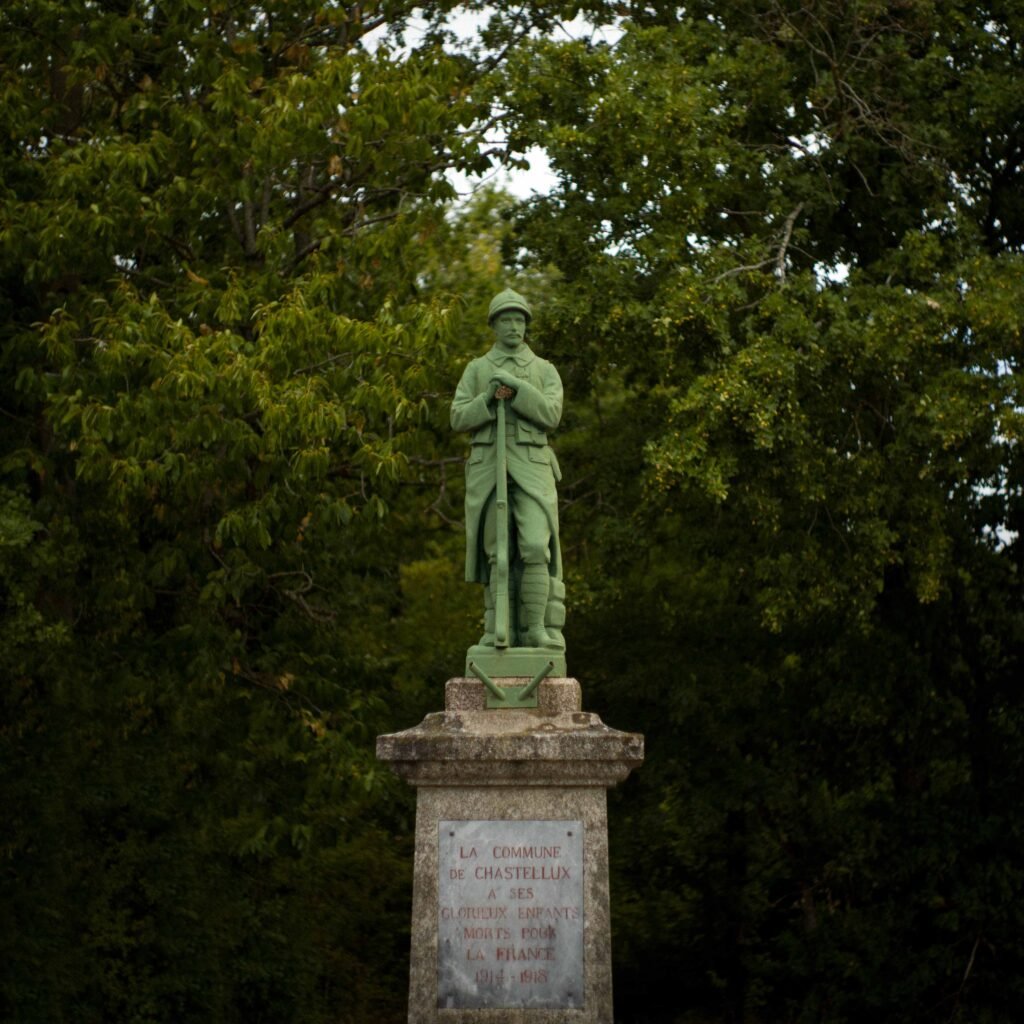 modèle « poilu au repos », statue d’étienne camus, le terme « poilu » vient de l’expression « avoir du poil » qui signifie « avoir du courage », sur ce modèle en fonte d’environ 1 mètre 60 de haut le poilu porte une moustache, il regarde fixement devant lui, il porte un casque, un long manteau, des bandes molletières, il a l’arme aux pieds, les deux mains posées sur le canon du fusil, sa main gauche par dessus sa main droite, c’est le modèle de statue de poilu que je rencontre le plus fréquemment au cours de mes balades à travers le centre de la france, il a été produit à plusieurs centaines d’exemplaires et érigé dans autant de villages
