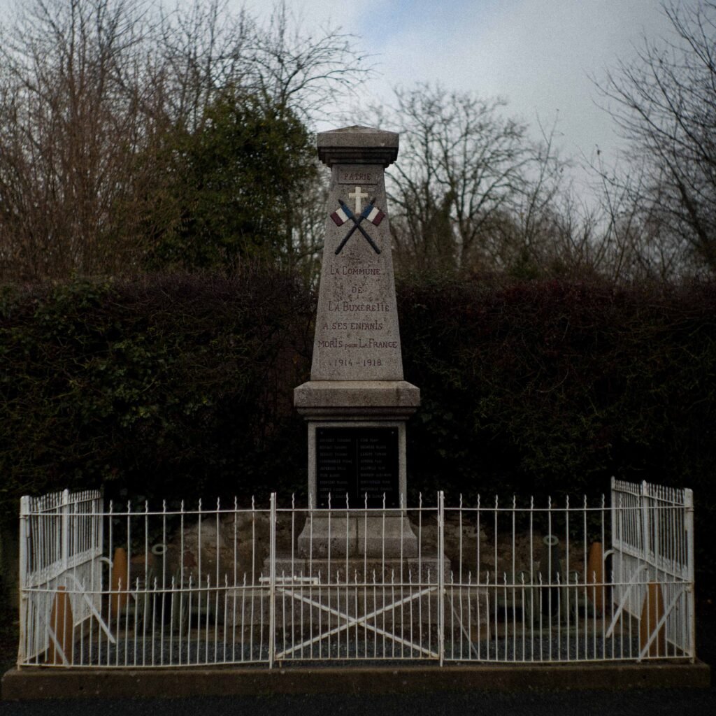 - la commune de la buxerette à ses enfants morts pour la france, obélisque surmonté d'un chapiteau, drapeaux français sculptés et peints, croisés autour d'une croix latine dorée, au sol canons et obus, entouré d'une grille sur trois côtés, la buxerette, indre