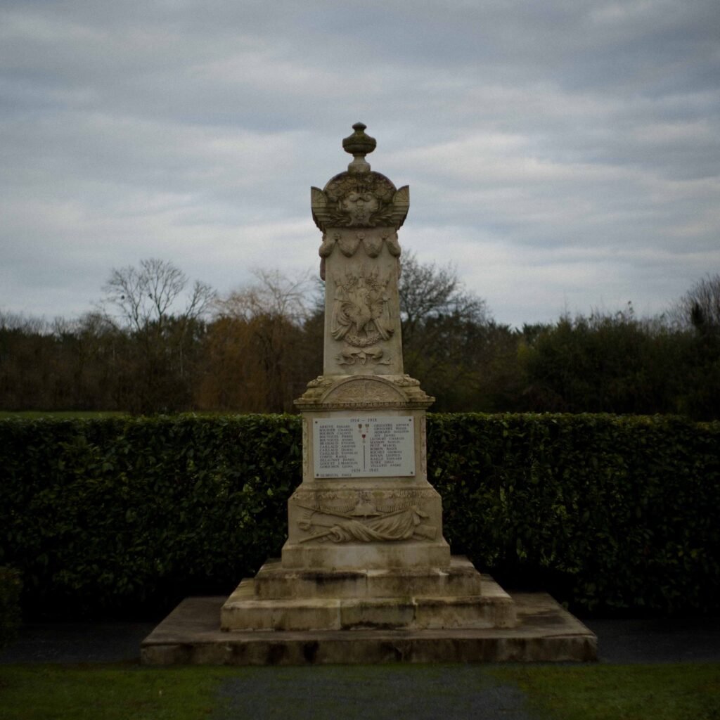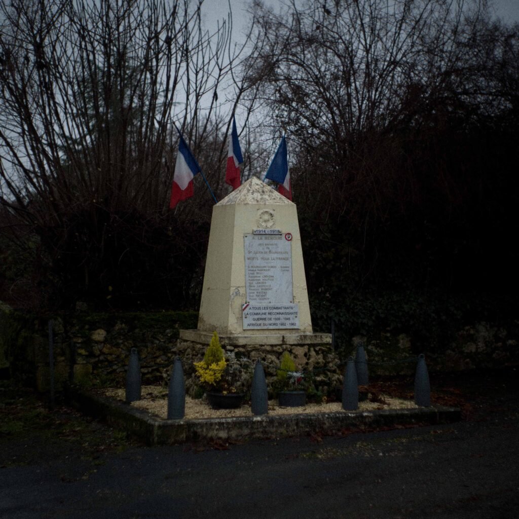 - à la mémoire des enfants de saint julien de bourdeilles, obélisque, fleur de coquelicot scupltée, au sol six obus reliés par une chaînes, dordogne