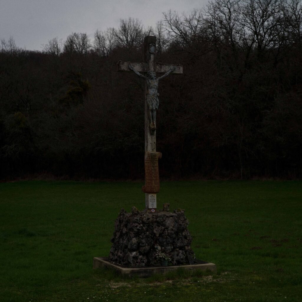 - en mémoire des soldats de bazincourt morts pour la france, ne les oublions jamais, r.i.p., une plaque commémorative approsée sur un calvaire, bazincourt-sur-saulx, meuse