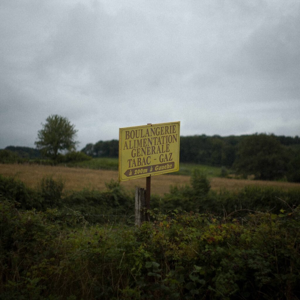 boulangerie, épicerie, alimentation, alimentation générale, boucherie, charcuterie, bar, tabac, gaz, pain et comté, régulièrement des distributeurs automatiques de pain, encore plus souvent des distributeurs automatiques de pizzas, j’ai aussi vu dans certains villages des distributeurs automatiques d’oeufs et même de viande, et des miettes pour les paysans