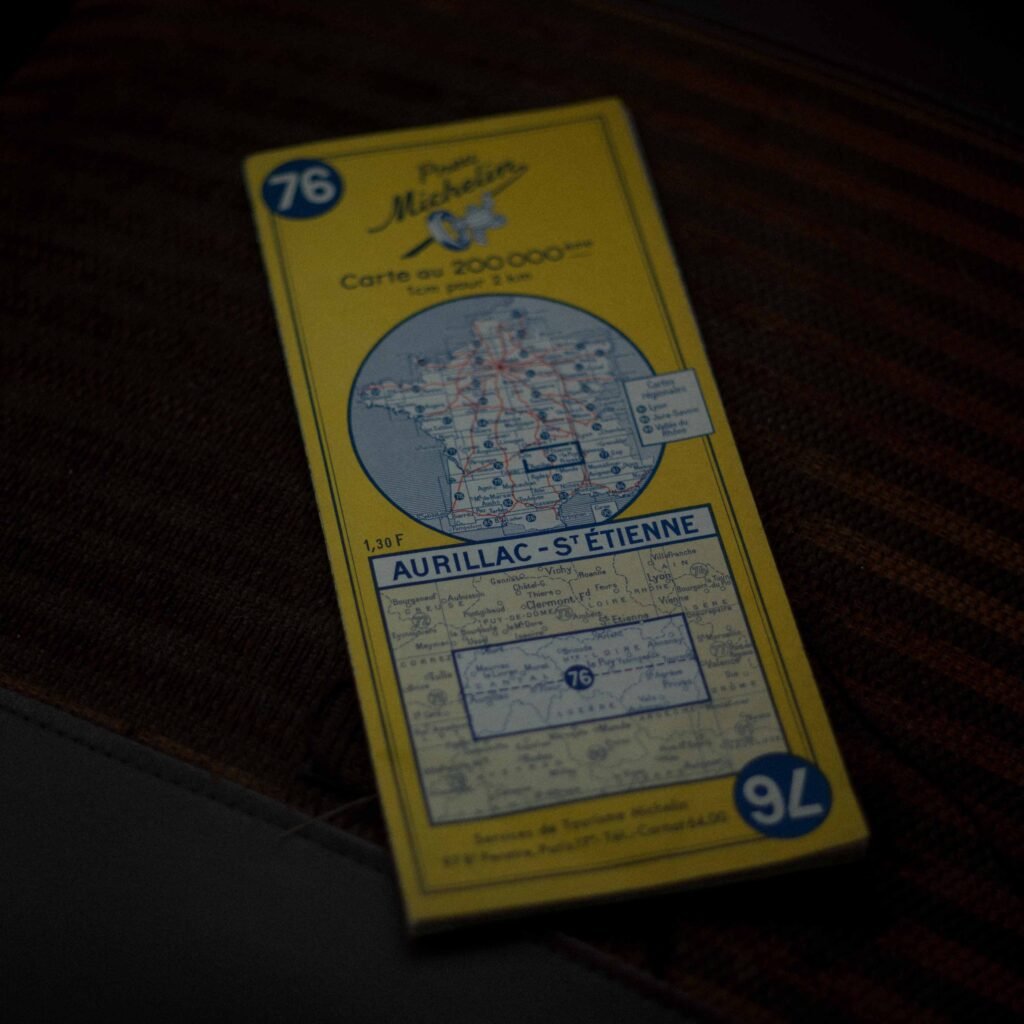 je parcours les routes jaunes et les routes blanches sur des cartes michelin au 1 : 200 000, la france continentale est découpée en 36 cartes, chaque carte est découpée en 20 plis, les cartes sont numérotées de 51 à 86, puis 87 pour l’alsace, 90 pour la corse, 91 pour les environs de lyon, 92 pour jura-savoie, 93 pour la vallée du rhône, 97 pour les « 150km autour de paris », ma maison se trouve sur la carte 65, le morvan à cheval sur les cartes 65 et 69, cartes 68, 72, 75 et 71 pour aller chez mes parents, cartes 73, 76 et 80 pour aller dans le massif central, 62 pour aller dans les vosges, 61 pour la champagne, 66 et 70 pour la franche-comté, je photographie celles dont je me sers, posée sur le siège passager de ma vieille 4l, un siège en tissu, bandes orange et marron, j’ai au moins un exemplaire de chacune des autres cartes, elles me serviront peut-être toutes un jour, même la 90, j’ai promis de m’en servir, mais il me faudra du temps